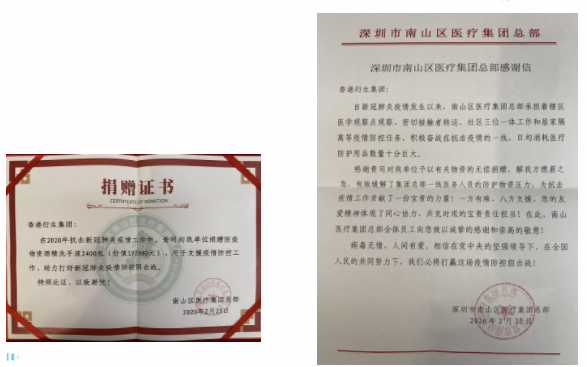 捐贈(zèng)儀式上,南山區(qū)醫(yī)療集團(tuán)總部副總院長(zhǎng)張飛先生表示:感謝香港衍生集團(tuán)為一線(xiàn)醫(yī)護(hù)工作者捐贈(zèng)物資,這是香港衍生集團(tuán)大愛(ài)的彰顯,這不僅溫暖了醫(yī)護(hù)人員的心,更激勵(lì)了我們抗擊疫情的斗志!